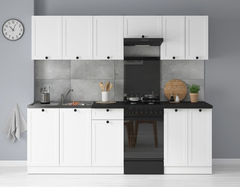 Jeśli szukasz rozwiązania, które natychmiast odmieni Twoją przestrzeń i jednocześnie przyciągnie uwagę każdego gościa, angielski komplet kuchenny 230 z blatem JUNONA 19 jest dokładnie tym, czego potrzebujesz. To zestaw zaprojektowany z myślą o nowoczesnych wnętrzach, w których liczy się zarówno estetyka, jak i praktyczność. Już na pierwszy rzut oka przyciąga minimalistycznym designem i eleganckim wykończeniem, które doskonale wpisuje się w aktualne trendy wnętrzarskie.