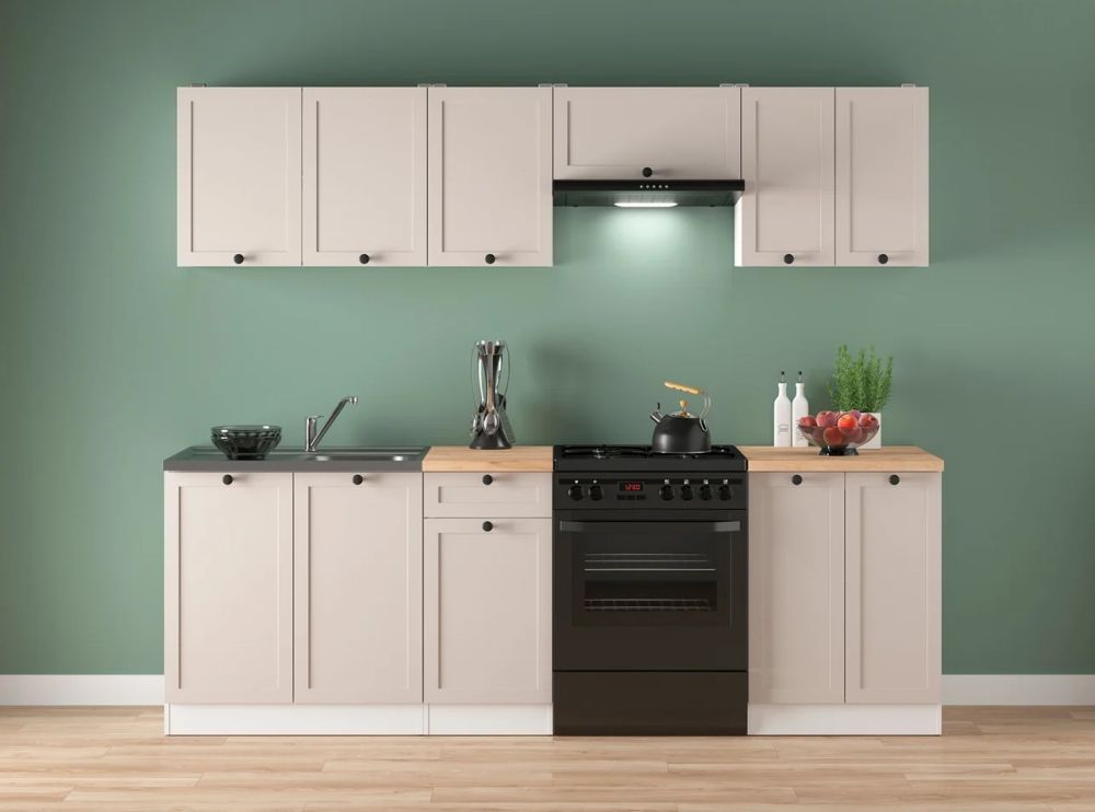 Zestaw o długości 240 cm oferuje optymalne rozmieszczenie szafek, które pozwala na wygodne przechowywanie wszystkich niezbędnych produktów i akcesoriów kuchennych. Szafki dolne o wysokości 85,7 cm i głębokości 47 cm zapewniają przestronną powierzchnię do przechowywania, podczas gdy szafki górne o wysokości 57,5 cm i głębokości 30,5 cm idealnie dopełniają funkcjonalność kuchni, nie zabierając przy tym miejsca w pomieszczeniu. Gruby blat o wymiarze 3,2 cm gwarantuje solidność i wytrzymałość podczas codziennego użytkowania.
