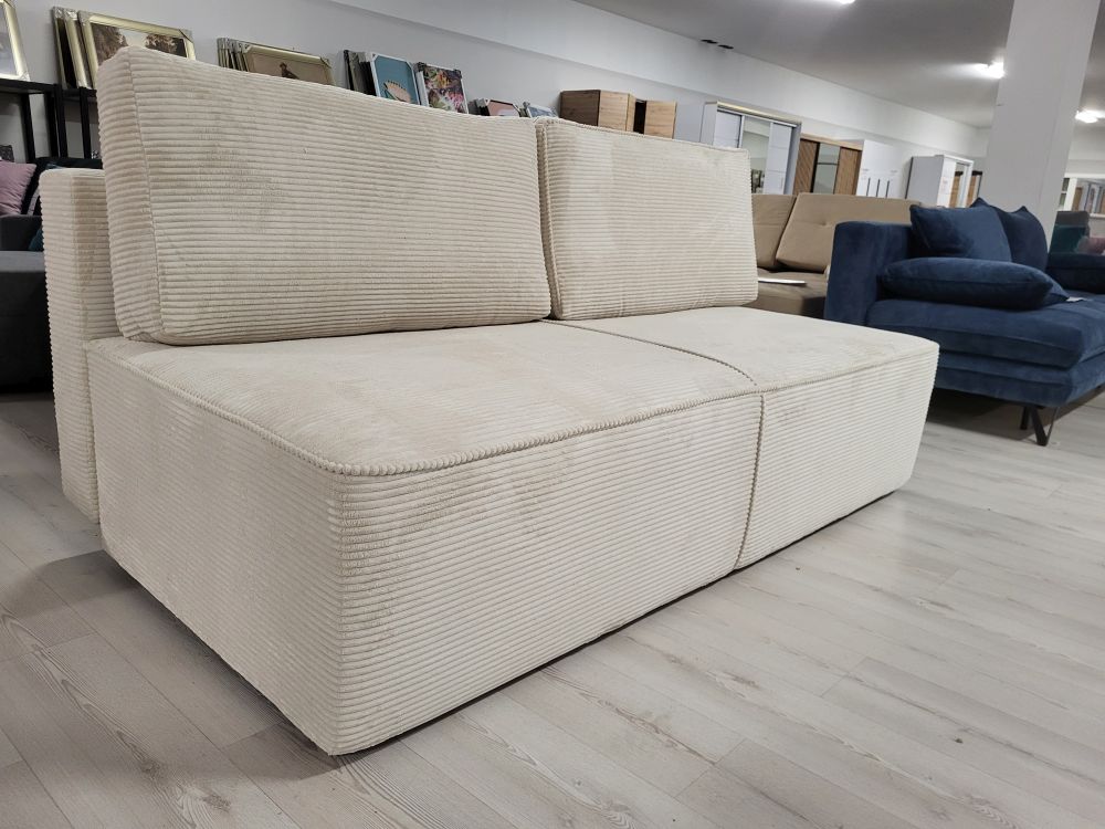 Beżowa sofa sztruksowa z dużą powierzchnią spania bez boków MELORIA pozwala optymalnie wykorzystać dostępną przestrzeń, oferując maksymalny komfort bez kompromisów. To doskonały wybór dla osób, które szukają funkcjonalnych, estetycznych i praktycznych rozwiązań do swojego domu lub mieszkania.