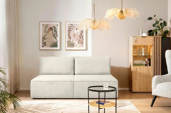 Beżowa sofa sztruksowa z dużą powierzchnią spania bez boków MELORIA doskonale sprawdzi się również w apartamentach na wynajem, pensjonatach oraz domkach letniskowych, gdzie liczy się trwałość, komfort oraz estetyka. Uniwersalny design sprawia, że mebel ten przypadnie do gustu szerokiemu gronu klientów, podnosząc standard wnętrza i jego atrakcyjność.