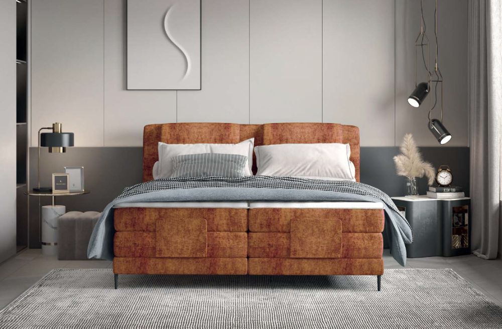 Łóżko kontynentalne elektryczne 160 WAVE zachwyca swoim wyglądem już od pierwszego spojrzenia. Ozdobne wezgłowie oraz tapicerowana rama nadają mu ponadczasowy styl, który świetnie komponuje się zarówno w nowoczesnych wnętrzach, jak i bardziej klasycznych aranżacjach. Solidne nóżki podkreślają stabilność całej konstrukcji, a starannie dobrane tkaniny sprawiają, że całość prezentuje się luksusowo i elegancko. To nie jest zwykłe łóżko – to element wystroju, który natychmiast przyciąga uwagę i nadaje sypialni wyjątkowego charakteru.