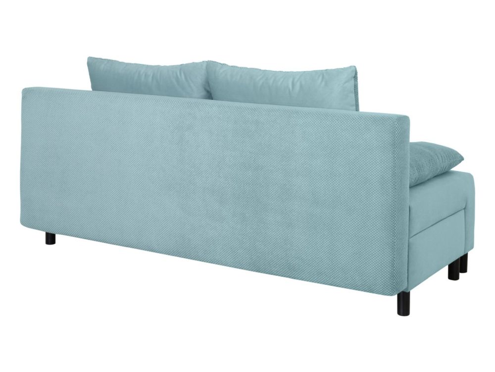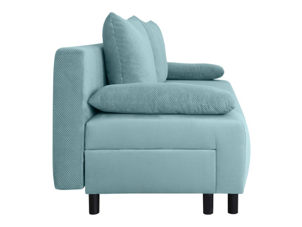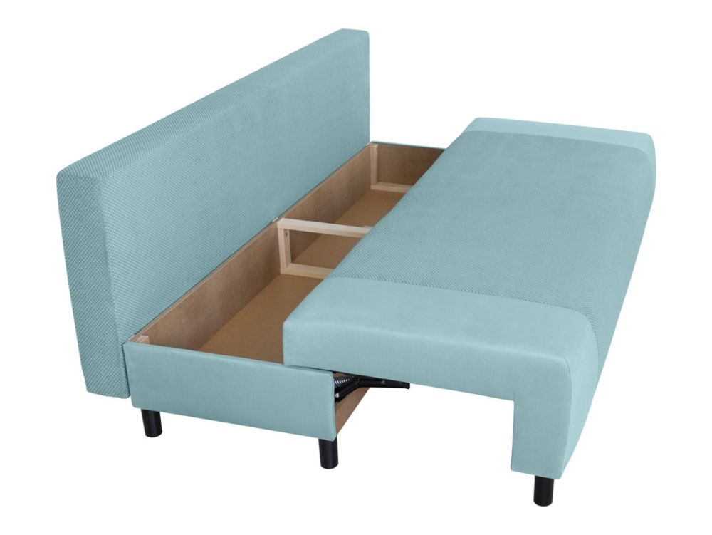 Miętowa sofa trzyosobowa rozkładana z pojemnikiem NUIS charakteryzuje się nowoczesną, minimalistyczną formą, która jest uniwersalna i ponadczasowa. Jej ozdobą są ozdobne przeszycia, które nie są jedynie elementem dekoracyjnym. Pełnią one również funkcję praktyczną, zwiększając trwałość obicia i stabilność wypełnienia, zapobiegając jego przemieszczaniu się. Nadają one sofie interesujący charakter i subtelnie dają jednolitą płaszczyznę materiału. Miętowy kolor obicia to stonowany, ale jednocześnie orzeźwiający odcień, który ożywi neutralne wnętrze. Jest to kolor, który dobrze komponuje się z różnymi odcieniami szarości, beżu, bieli czy drewna, dając szerokie możliwości aranżacyjne. Sofa w tym kolorze będzie eleganckim i stylowym akcentem w salonie.