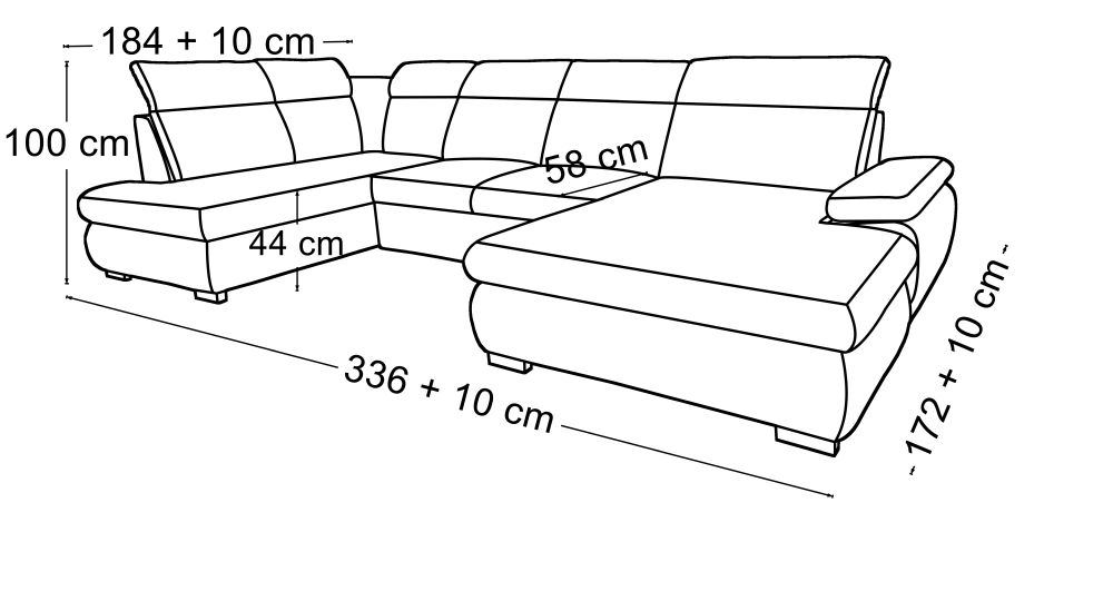 Szerokość 346 cm zapewnia dużo miejsca do wypoczynku. Głębokość 194/182 cm gwarantuje komfort użytkowania. Wysokość 100 cm zapewnia odpowiednie podparcie dla pleców. To narożnik idealny do dużych salonów. To przestrzeń, która sprzyja relaksowi. To komfort dla całej rodziny.