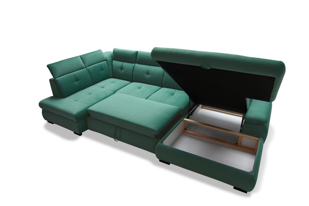 Narożnik U z regulacją zagłówków i podłokietników WIND U wyposażono w jeden, duży pojemnik na pościel, który pomieści wszystkie niezbędne tekstylia. Dzięki temu zyskujesz dodatkową przestrzeń do przechowywania. To idealne rozwiązanie dla osób ceniących porządek. To sposób na lepszą organizację wnętrza. To praktyczny element, który zwiększa funkcjonalność mebla. To wygoda, którą docenisz każdego dnia.