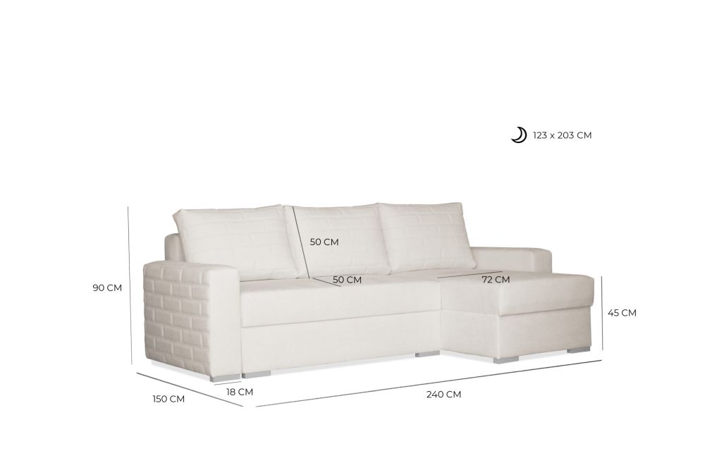 Jeśli cenisz praktyczność, narożnik uniwersalny BRICK z pewnością Cię zachwyci. Wbudowana funkcja spania sprawia, że w kilka chwil możesz zmienić narożnik w pełnowymiarowe łóżko o powierzchni 123 × 203 cm. Mechanizm Delfin umożliwia wyjątkowo łatwe i szybkie rozkładanie — bez wysiłku, bez problemów i bez zbędnych komplikacji.