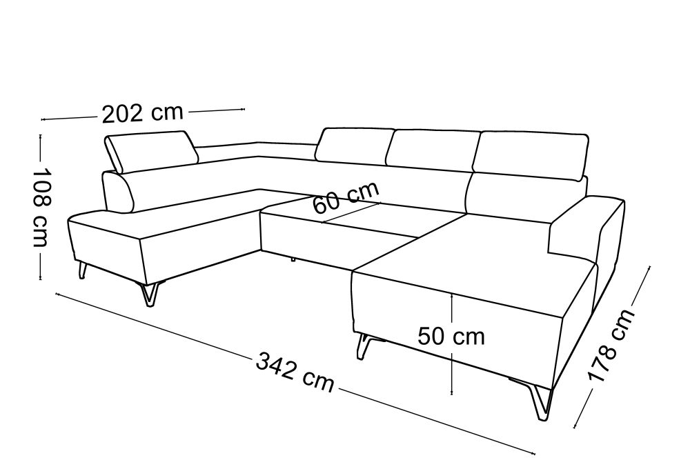 Imponujące wymiary sprawiają, że narożnik idealnie wypełni większe wnętrza, nadając im elegancki i nowoczesny charakter. Szerokość aż 342 cm oraz głębokość sięgająca 202 cm gwarantują ogromną przestrzeń do wypoczynku. To doskonałe rozwiązanie dla rodzin, gości oraz wszystkich, którzy cenią sobie swobodę i wygodę.