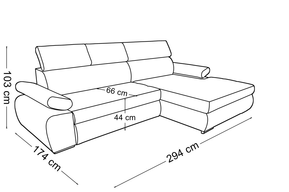Narożnik z ruchomymi podłokietnikami i zagłówkami VILDE wyróżnia się nowoczesną formą i dopracowanymi proporcjami. Jego imponująca szerokość 294 cm sprawia, że staje się głównym punktem aranżacji, nadając wnętrzu charakteru i klasy. Głębokość 174 cm zapewnia wyjątkową przestrzeń do wypoczynku, zarówno dla jednej osoby, jak i całej rodziny. Wysokość 103 cm została zaprojektowana tak, aby zapewnić optymalne podparcie pleców i komfort podczas długiego siedzenia.