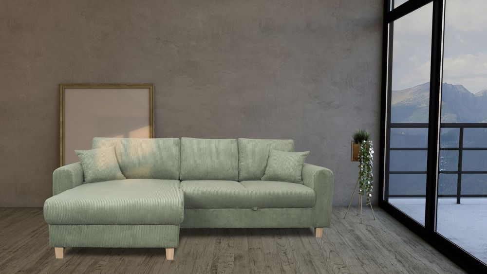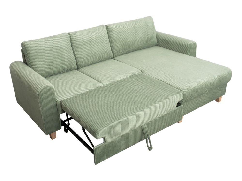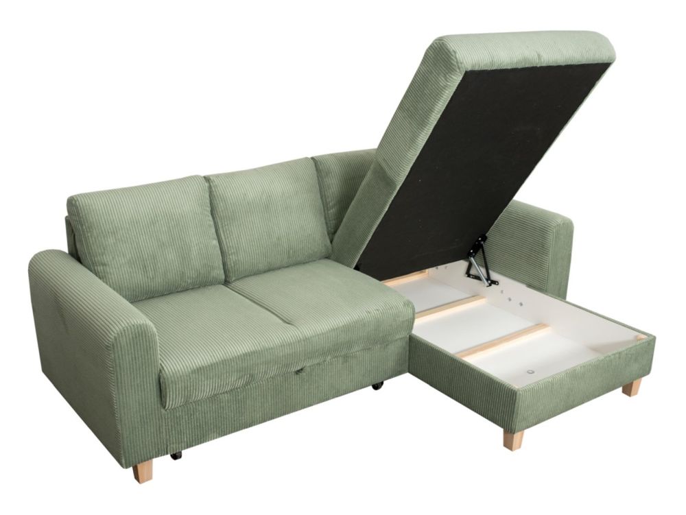 Oliwkowy narożnik sztruksowy rozkładany LILLE został wyposażony w niezwykle wygodny mechanizm rozkładania typu Delfin, który działa lekko, intuicyjnie i bez konieczności użycia dużej siły. Dzięki temu w zaledwie kilka chwil możesz przekształcić elegancką sofę w komfortową przestrzeń do spania. Dodatkowym atutem jest pojemny schowek na pościel – praktyczny i dyskretny, idealny na kołdry, poduszki czy koce. To rozwiązanie, które pokochasz za oszczędność miejsca i wygodę. Strona uniwersalna narożnika daje swobodę aranżacji, umożliwiając dopasowanie mebla do układu każdego pomieszczenia.