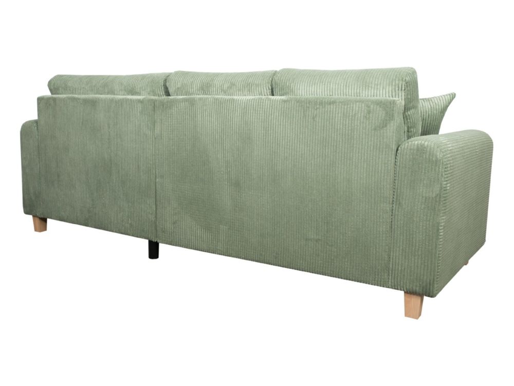 Szkielet narożnika został wykonany z połączenia drewna oraz płyty meblowej, co gwarantuje stabilność, trwałość i odporność na codzienne użytkowanie. Dzięki takim materiałom mebel pozostaje niezawodny i solidny przez długie lata. Ozdobne nóżki dodają mu lekkości, a jednocześnie podkreślają elegancki charakter całej konstrukcji. Każdy element został zaprojektowany z myślą o maksymalnym komforcie i estetyce, aby oliwkowy narożnik sztruksowy rozkładany LILLE stał się nie tylko meblem, ale prawdziwą ozdobą Twojego salonu.