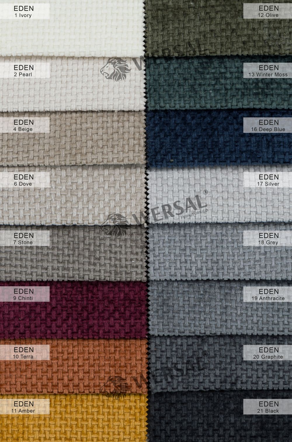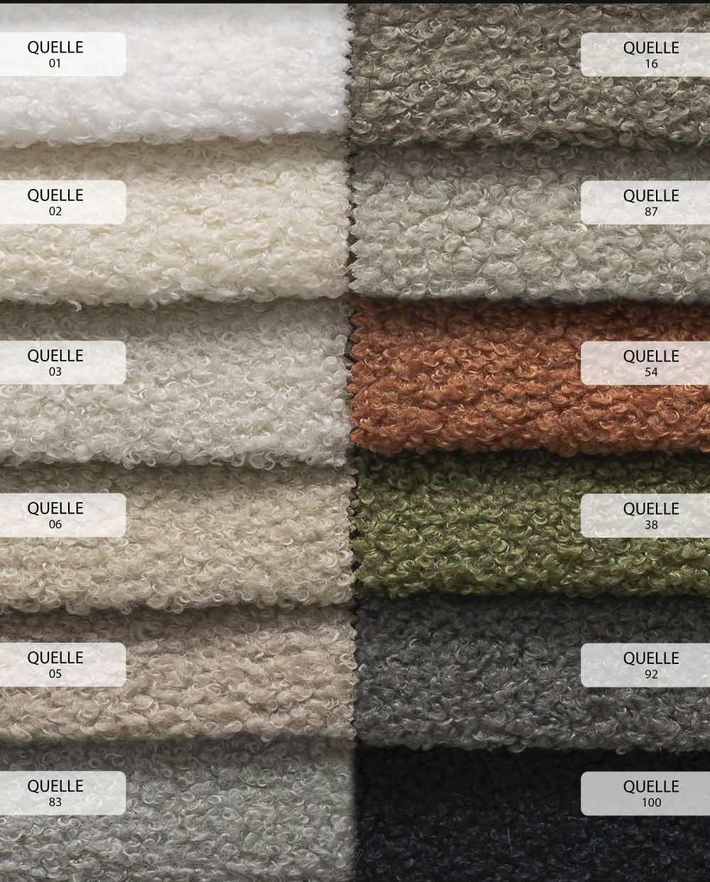 Tkanina QUELLE – nowoczesna tkanina typu boucle (baranek), miła w dotyku, mięsista i plastyczna. Niezwykle modna i elegancka, która charakteryzuje się wysoką odpornością na ścieranie oraz niską skłonnością do mechacenia.