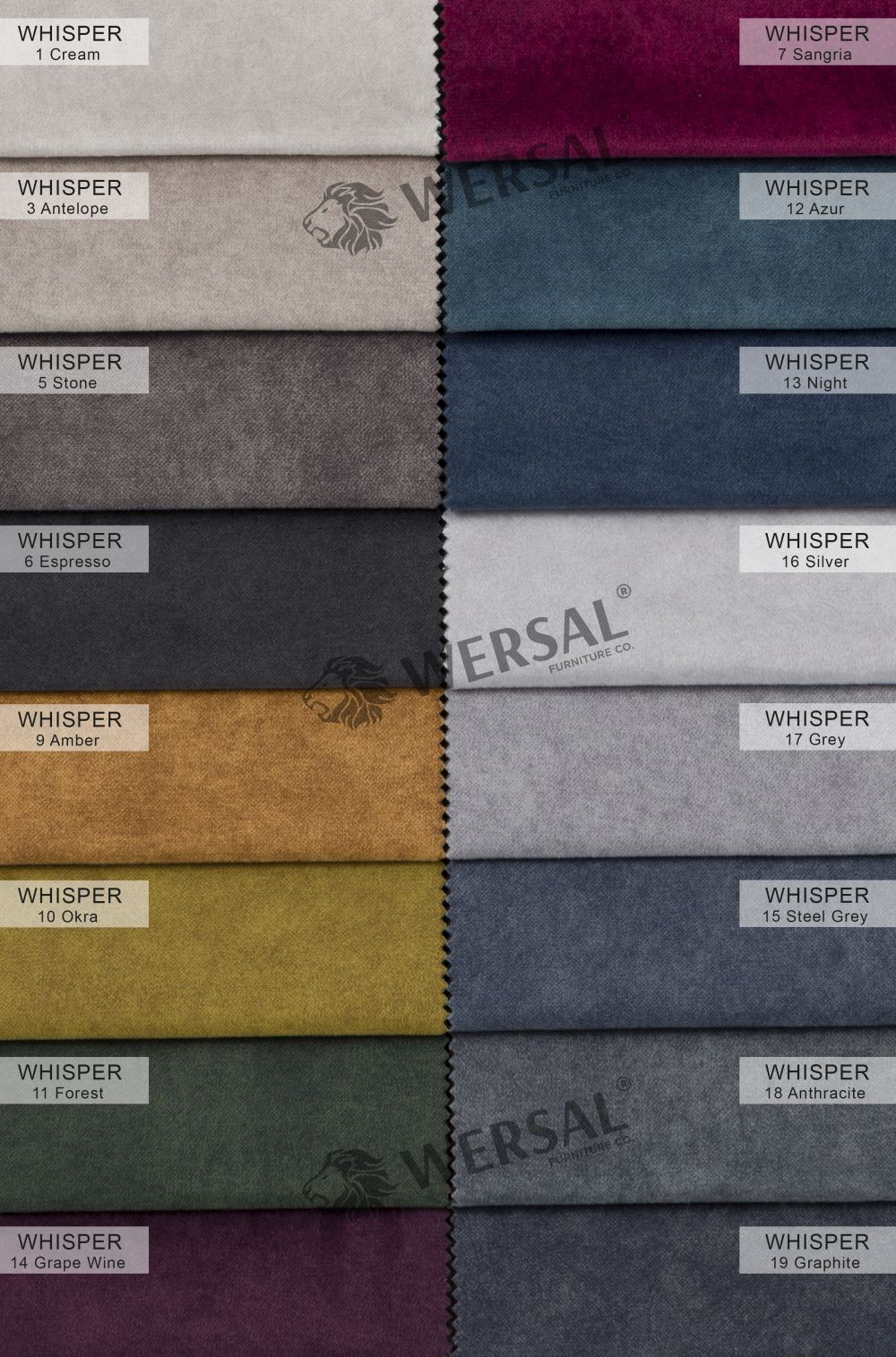 Tkanina WHISPER – charakteryzuje się niezwykle wysoką odpornością na ścieranie, z wynikiem 100 000 cykli w teście Martindale’a. Dzięki temu możemy mieć pewność, że przygotowane obicia zachowają doskonałą kondycję, nawet po wielu latach użytkowania. Materiał jest bardzo miły w dotyku i cechuje się dość dużą objętością, co przemawia za zastosowaniem przede wszystkim na komfortowych meblach wypoczynkowych. Tkanina została wyposażona w specjalny podkład wzmacniający, co znajduje bezpośrednie przełożenie na jej parametry techniczne.