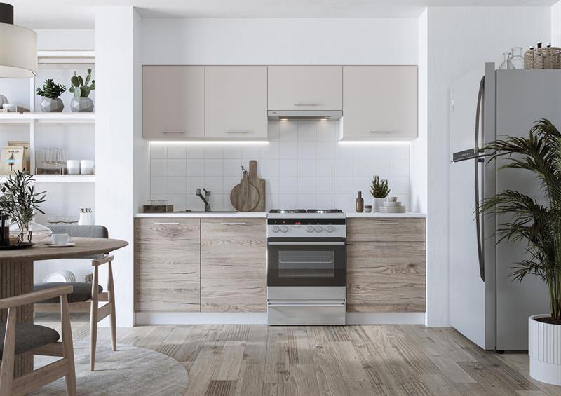 W zestawie JUNONA otrzymujesz wszystko, czego potrzebujesz, aby szybko i sprawnie urządzić kuchnię. W skład dolnych szafek wchodzą praktyczne moduły, które umożliwiają wygodne przechowywanie naczyń, garnków oraz produktów spożywczych. Górne szafki zapewniają dodatkową przestrzeń, dzięki której utrzymanie porządku staje się znacznie łatwiejsze.