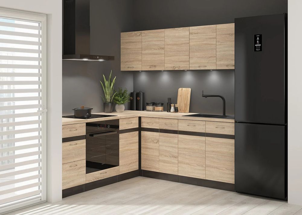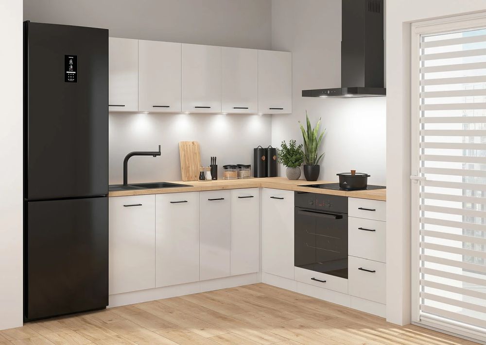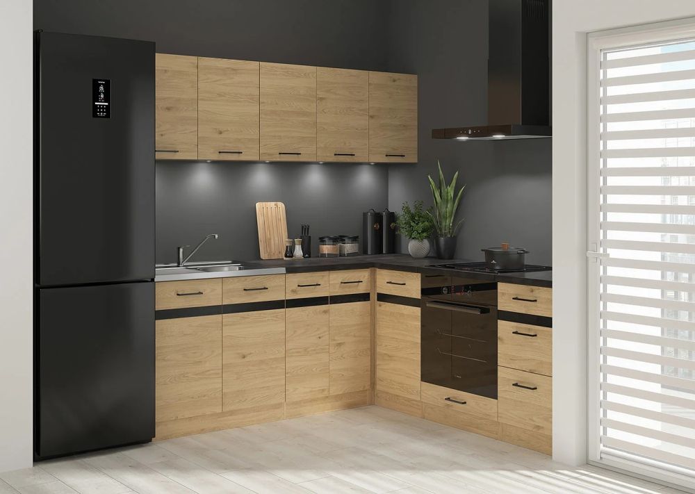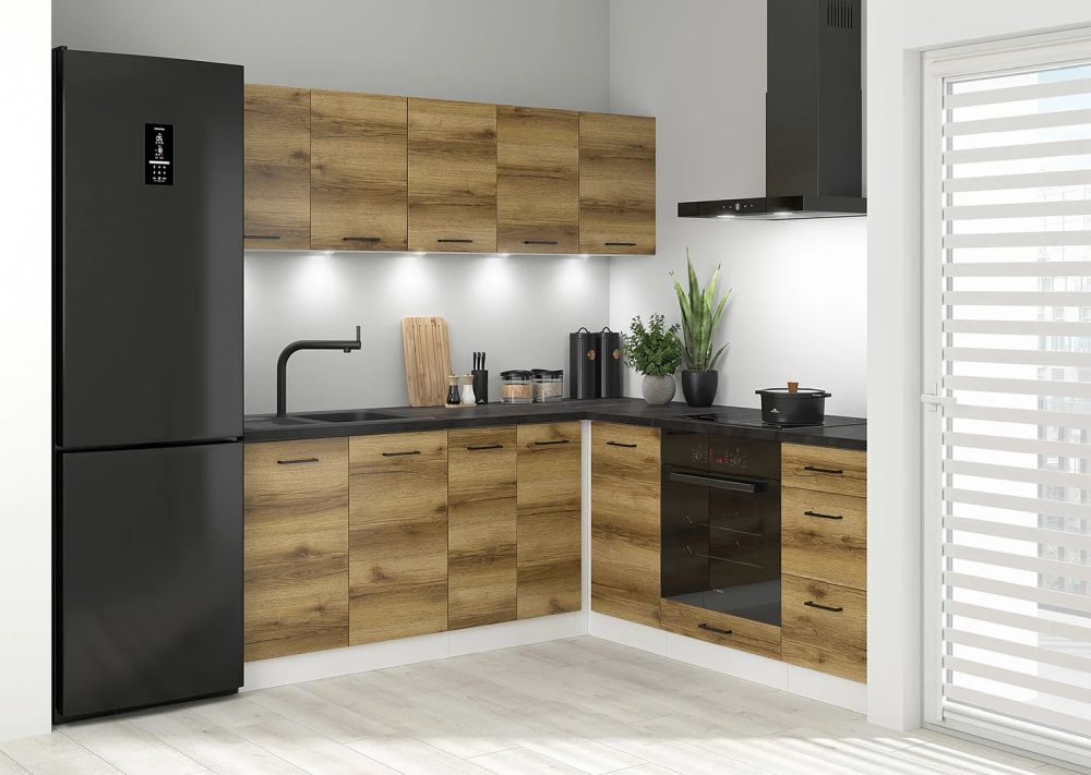 Zestaw kuchenny narożny 200×200 JUNONA zawiera starannie dobrane elementy dolne i górne, które tworzą spójną i funkcjonalną całość. W dolnej części znajdziesz praktyczne szafki, które pomieszczą wszystkie niezbędne akcesoria kuchenne, natomiast górne moduły zapewnią miejsce na przechowywanie produktów i naczyń. To rozwiązanie, które pozwala szybko stworzyć kompletną kuchnię bez konieczności długiego planowania.