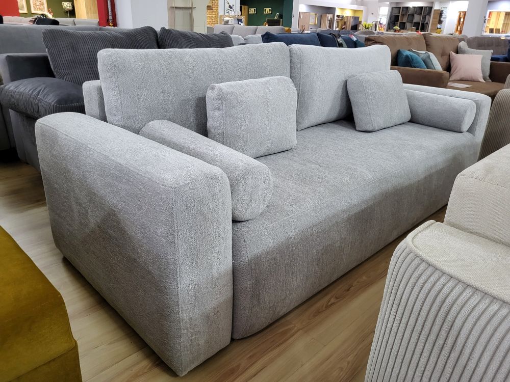 Szara sofa trzyosobowa rozkładana z pojemnikiem NUIS
